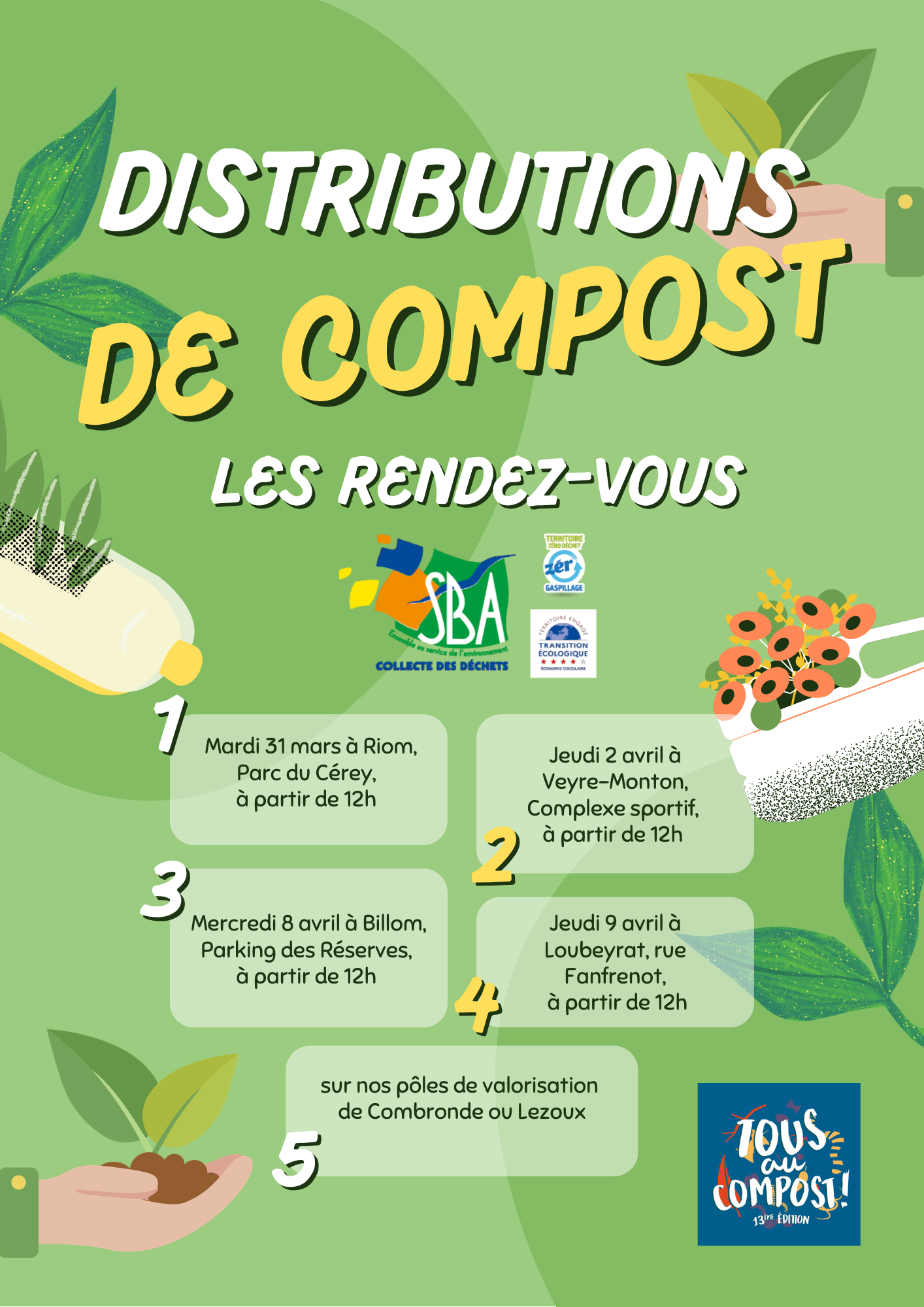 A l’occasion de l’opération nationale « Tous au compost », nos animateurs vous proposent des distributions gratuites de compost sur différents sites, et ce, jusqu’à épuisement des stocks :