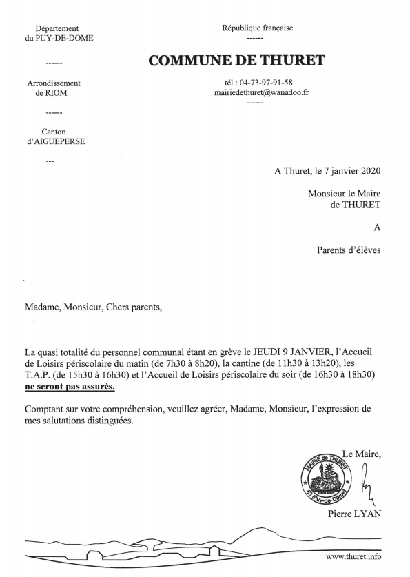 Grève du jeudi 9 janvier 2020 – pas de services périscolaires ni de TAP ni de restauration