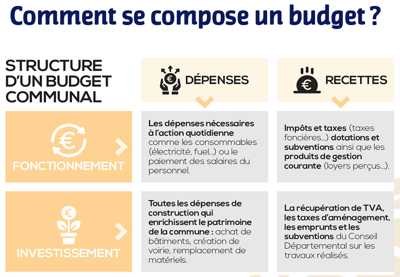 Le budget comprend la totalité des dépenses et la totalité des recettes, en deux parties, le fonctionnement et l’investissement.