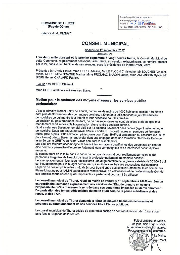 2 septembre 2017 - Dans L'Ecole‚ La Vie de la Commune‚ La Vie de la Mairie‚ La Vie des Enfants‚ Le centre de loisirs‚ Le Conseil Municipal‚ Les Comptes Rendus du Conseil‚ Les Services‚ Les TAP Par Pierre LYAN 0 Motion pour le maintien des moyens d’assurer les services publiques périscolaires Télécharger Motion pour le maintien des services périscolaires Précédent Comment se déroulera la rentrée scolaire ce lundi 4 septembre ??? Suivant Lundi 4 septembre, jour de rentrée spécial emplois aidés !
