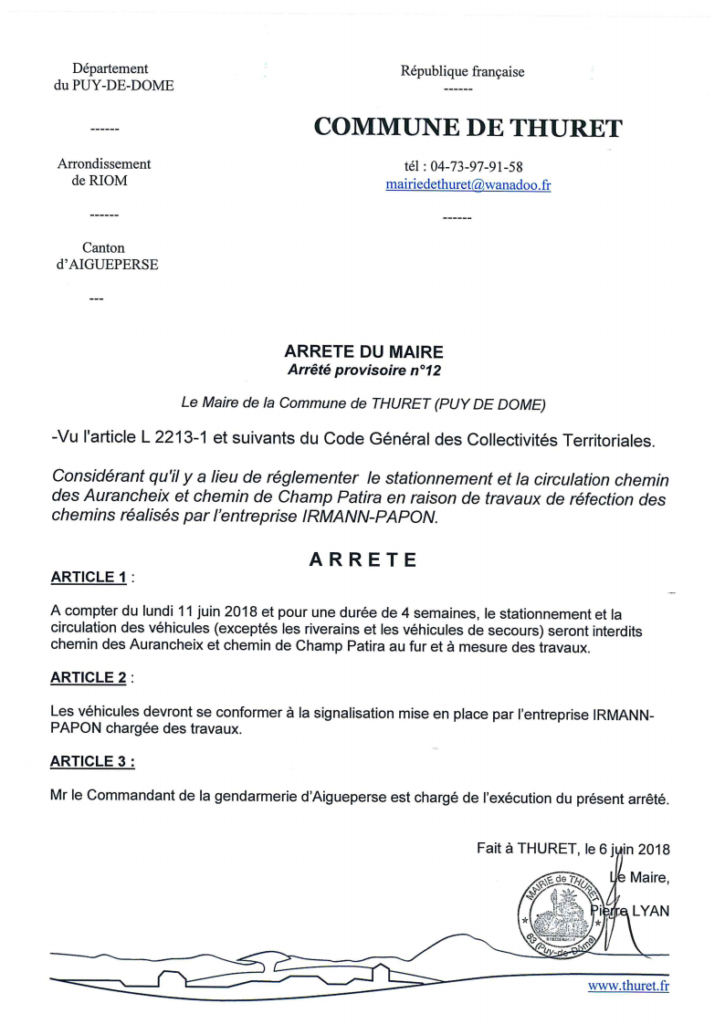 A compter du lundi 11 juin 2018 et pour une durée de 4 semaines, le stationnement et la circulation des véhicules (exceptés les riverains et les véhicules de secours) seront interdits chemin des Aurancheix et chemin de Champ Patira au fur et à mesure des travaux.