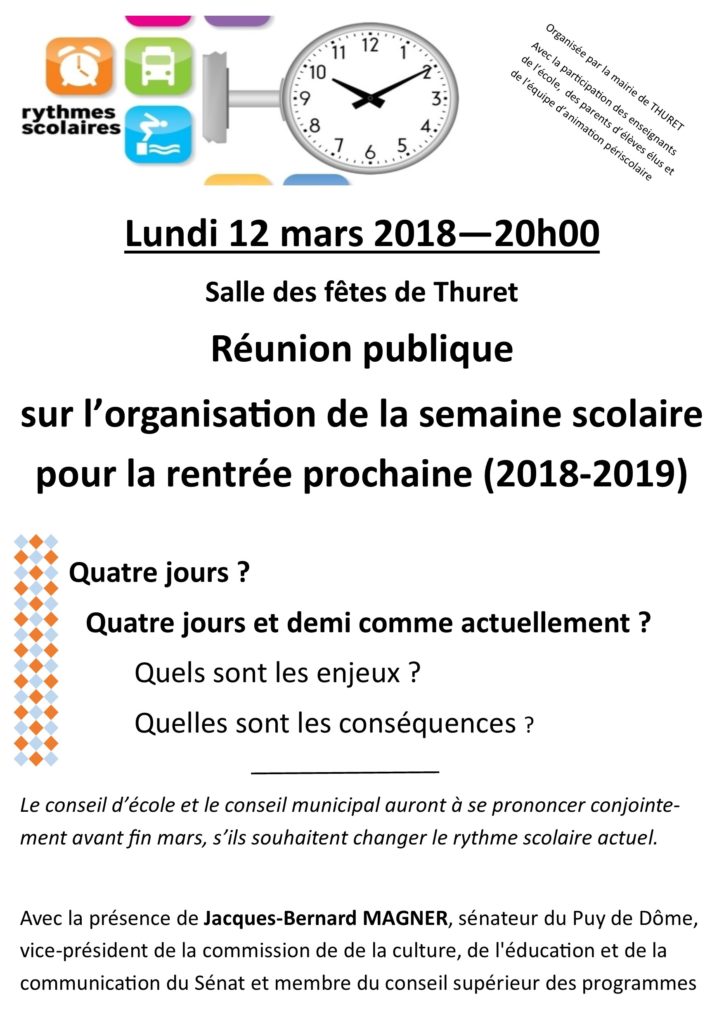 Réunion publique sur les rythmes scolaires – Lundi 12 mars 20h salle des fêtes de THURET